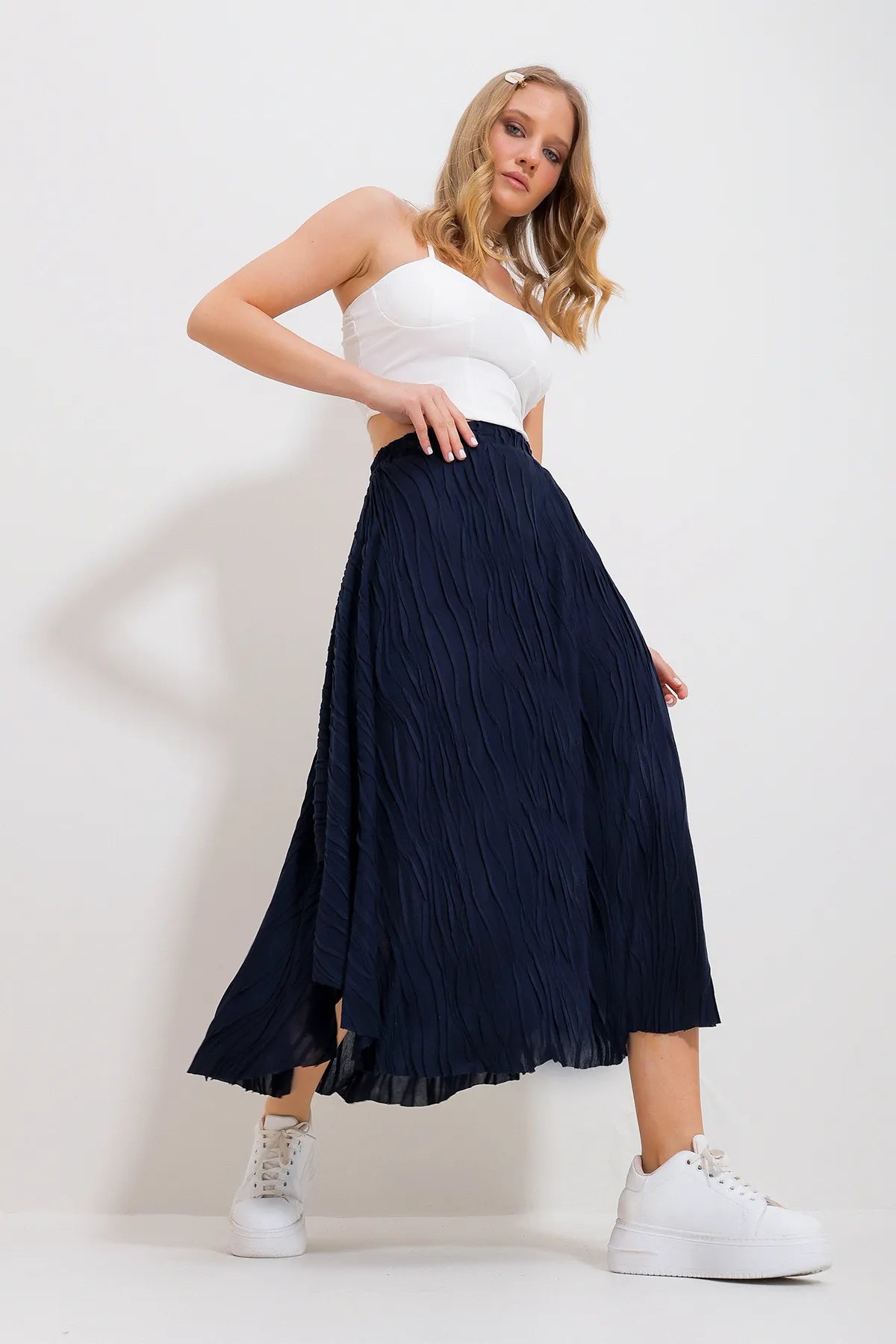 Trend Alacatı Style Women's Navy Blue Self-Textured Casual Skirt