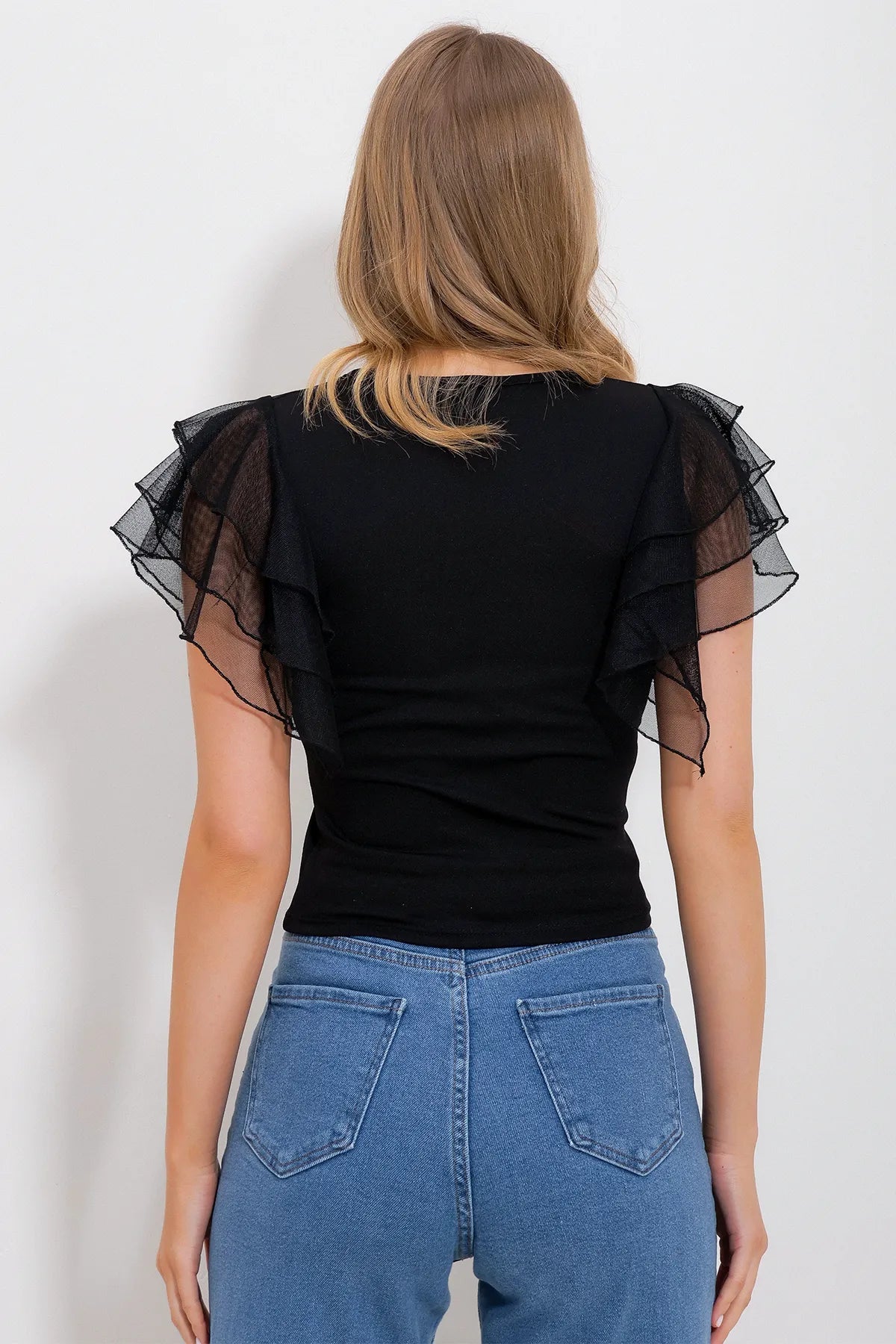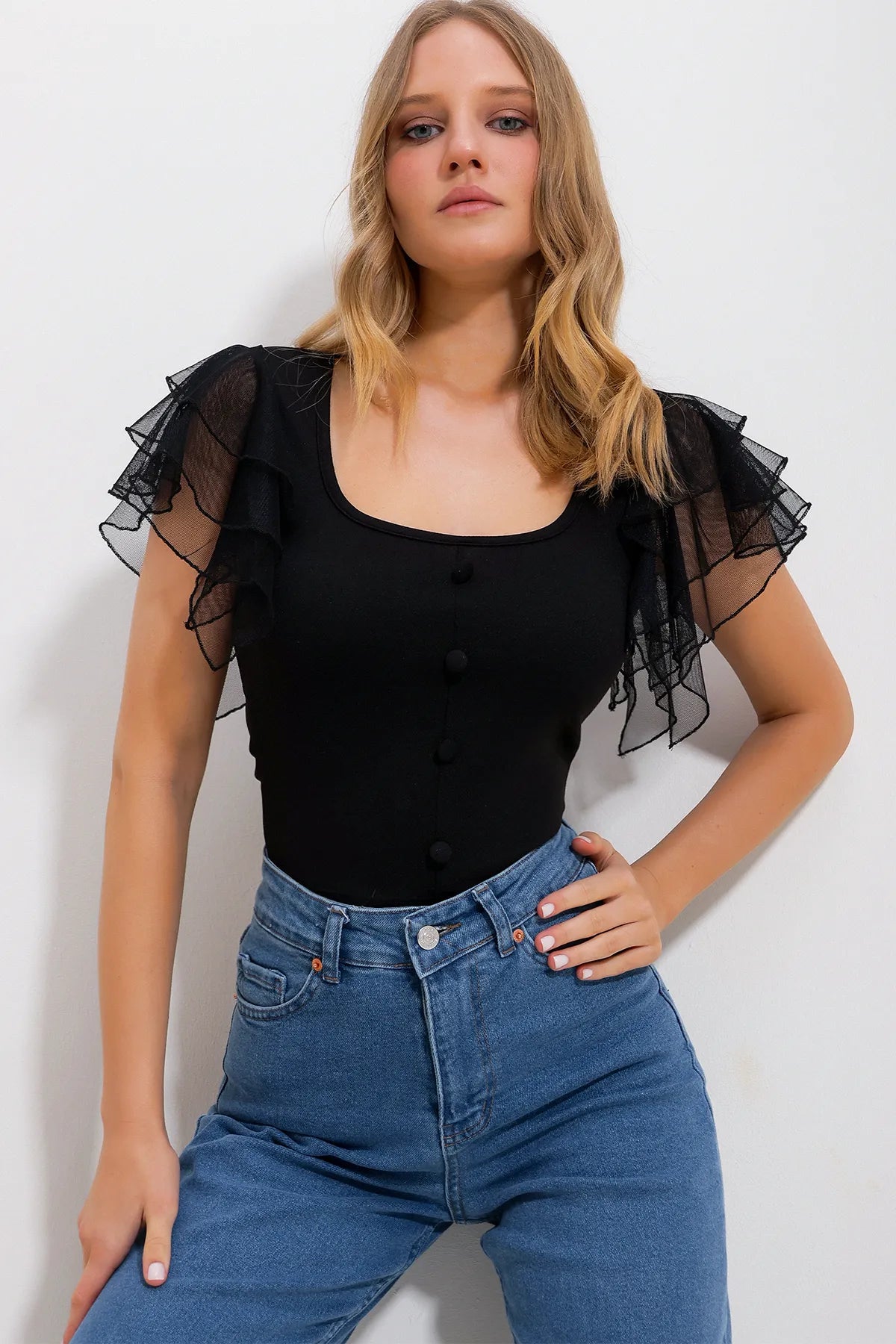 Trend Alaçatı Style Women's U-Neck Tulle Sleeve Button Detailed Blouse